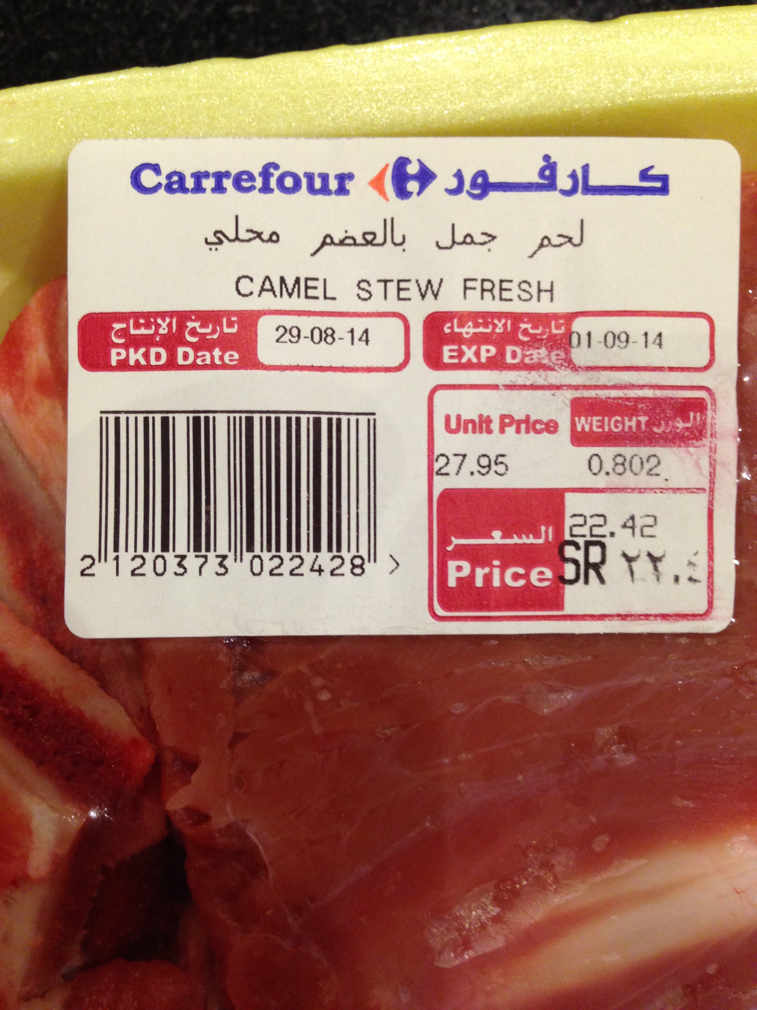 After my trips to the meat counters at the 2 grocery stores I’ve been to I decided that I was going to try something with an “exotic” meat! I went to the store that is below my apartment with the intention of getting a rabbit (Easter Bunny) to make a “coney stew”. Imagine my disappointment when I discovered they were out of rabbits!! Since I am here alone I decided that a whole goat might be a little over the top so I settled for……(drum roll!)…..Camel! Yup, that one or two humped furry thing that wonders the deserts here!